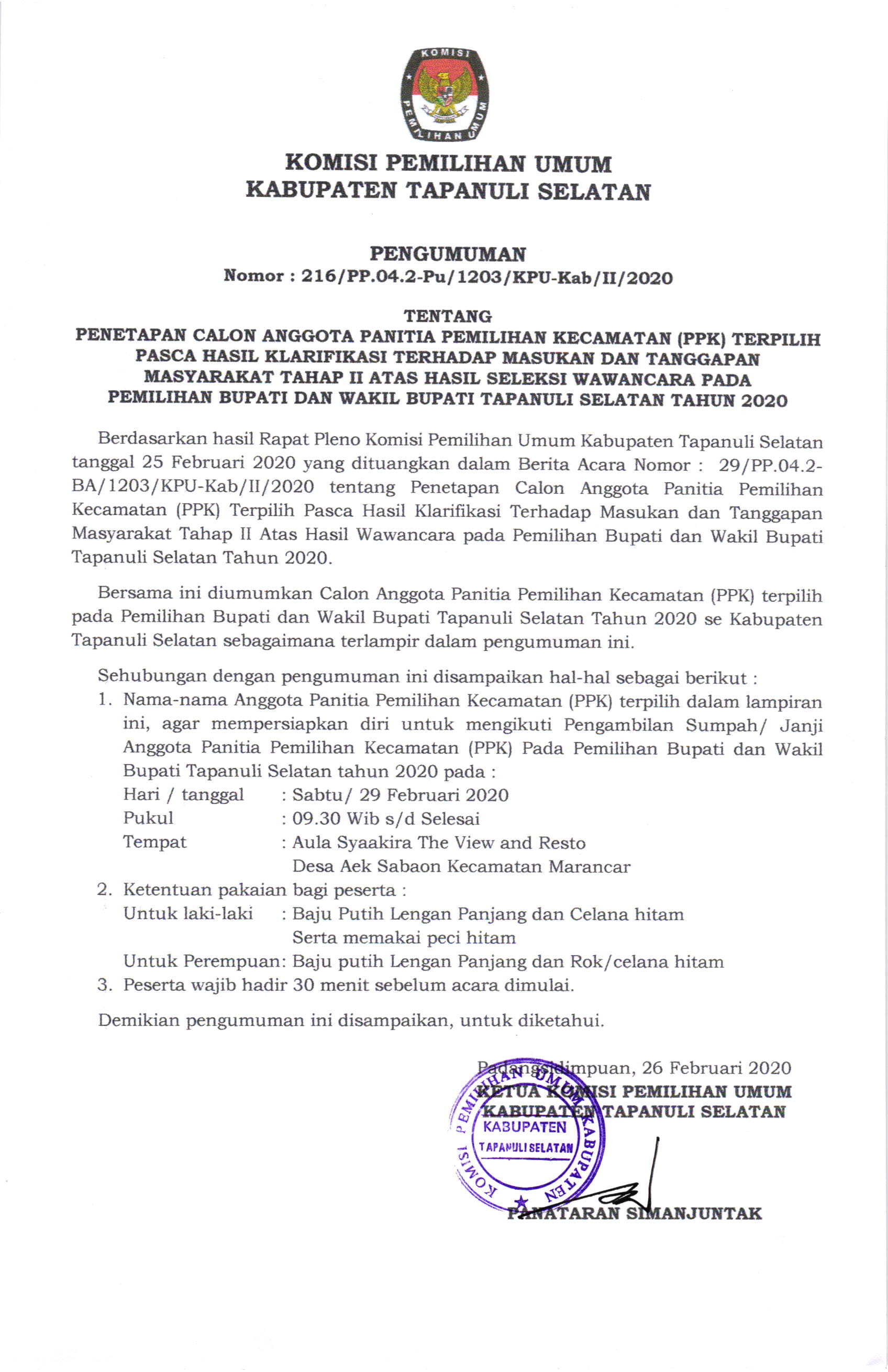 Pengumuman Hasil Seleksi Penelitian Administrasi Calon Panitia Pemungutan Suara Pada Pemilihan Bupati dan Wakil Bupati Tapanuli Selatan Tahun 2020